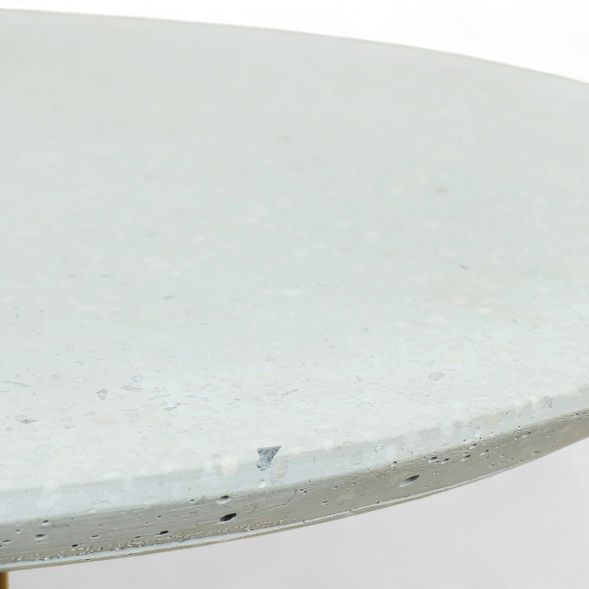 The multi-level design and off-center top on this modern coffee table give it a unique look perfect for adding interest to a space. It is crafted in gorgeous terrazzo with a gleaming metal support. Sleek and unassuming this sophisticated side table would be the perfect addition to a well-appointed seating area.