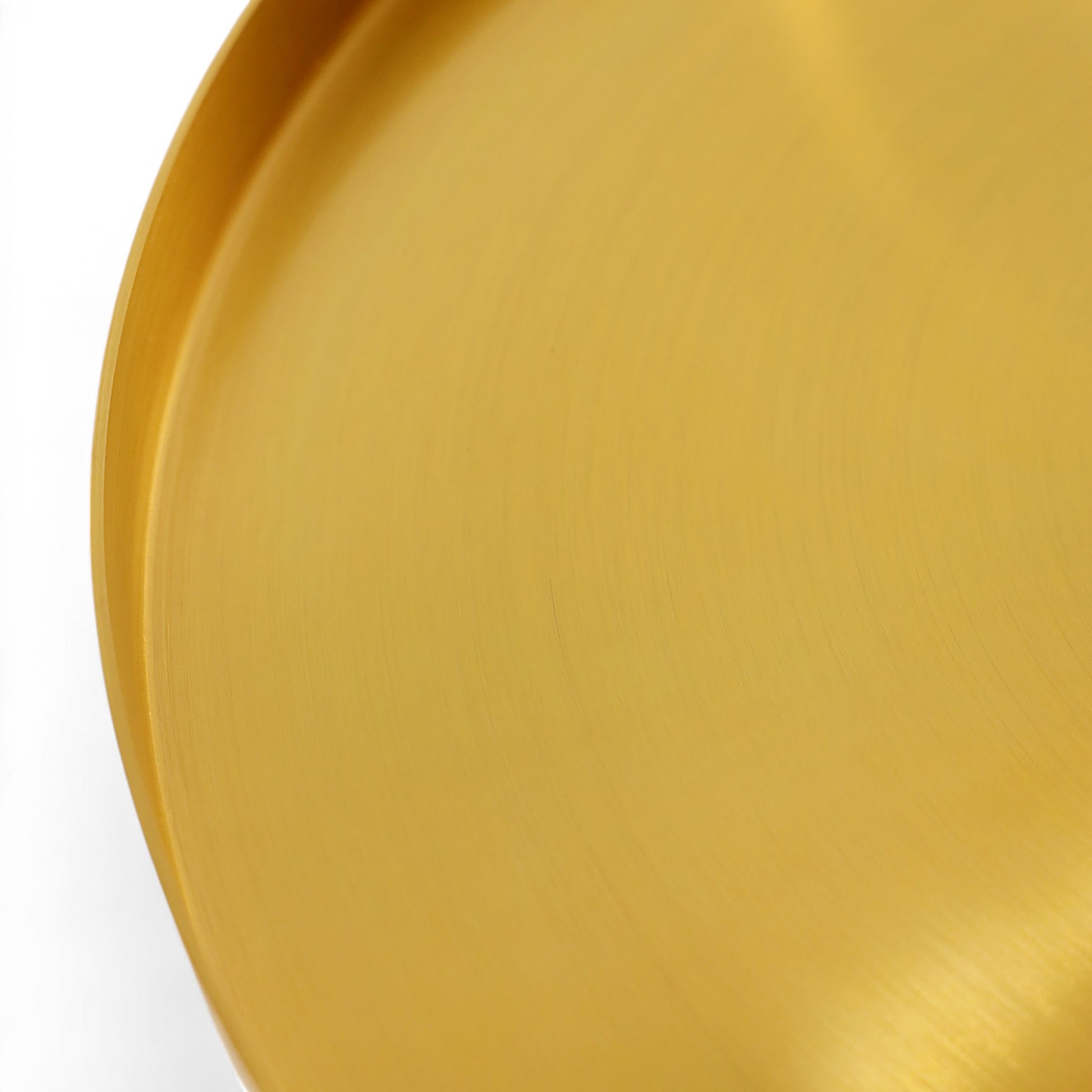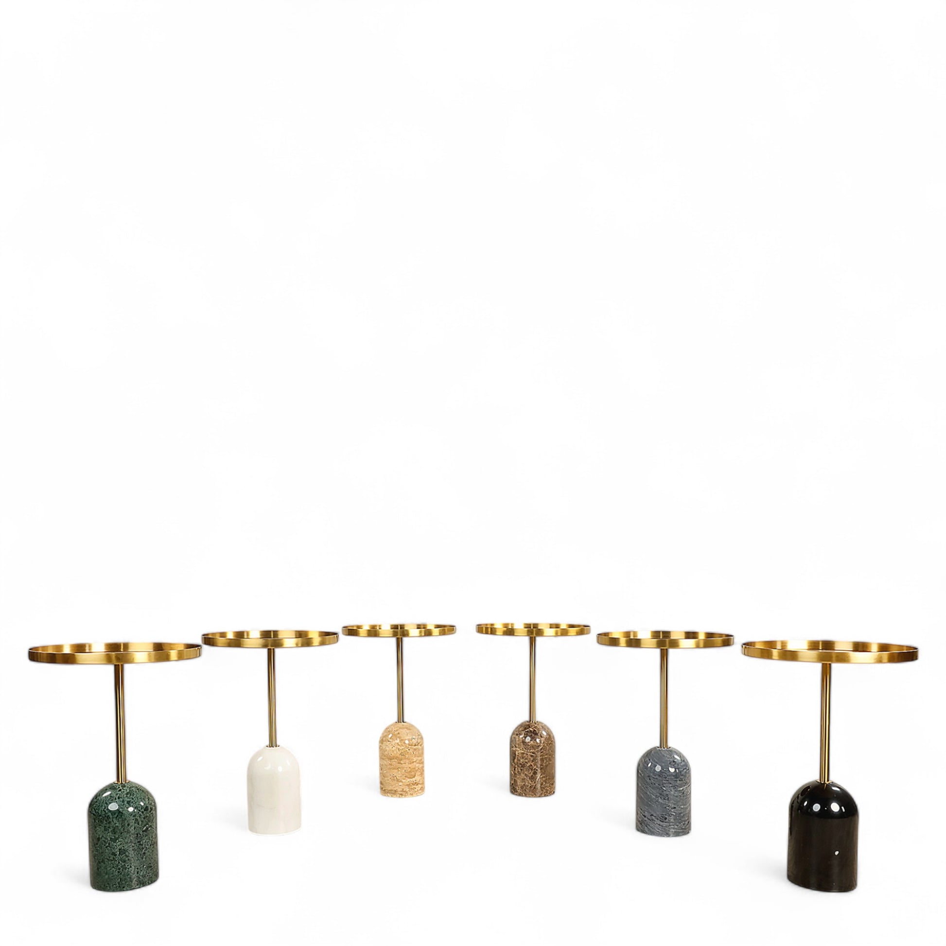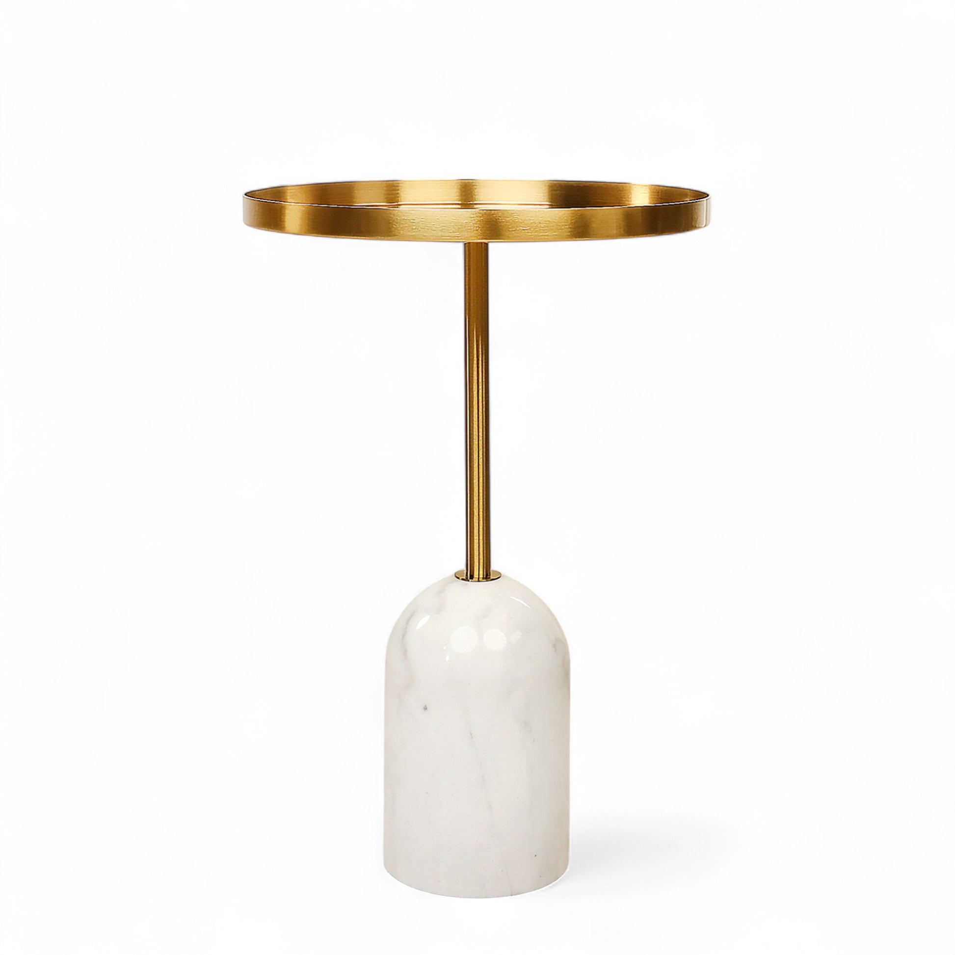 Designed to complement a variety of interior styles, the Camden Side Table serves as a functional and stylish accent. Its compact size makes it a versatile addition, fitting snugly beside sofas, armchairs, or beds. It features a gleaming metal surface and pole held in place by a beautiful marble base.