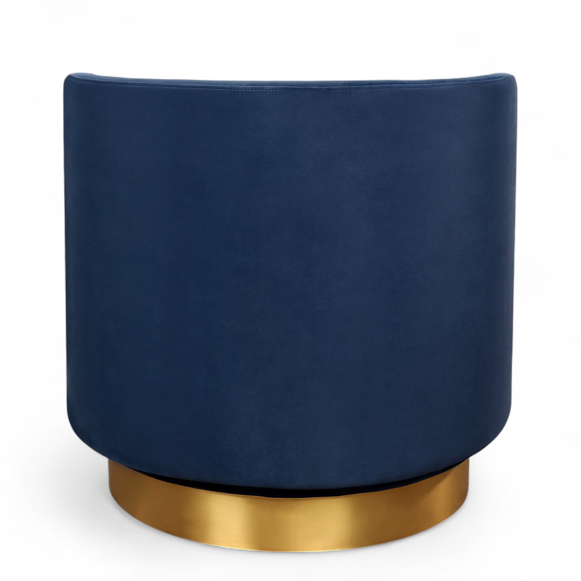 Upholstered in rich navy velvet this contemporary chair is a must-have for a glamorous aesthetic. The wonderfully versatile color, sleek design, and gleaming gold chrome base will make it a stand out in any room.