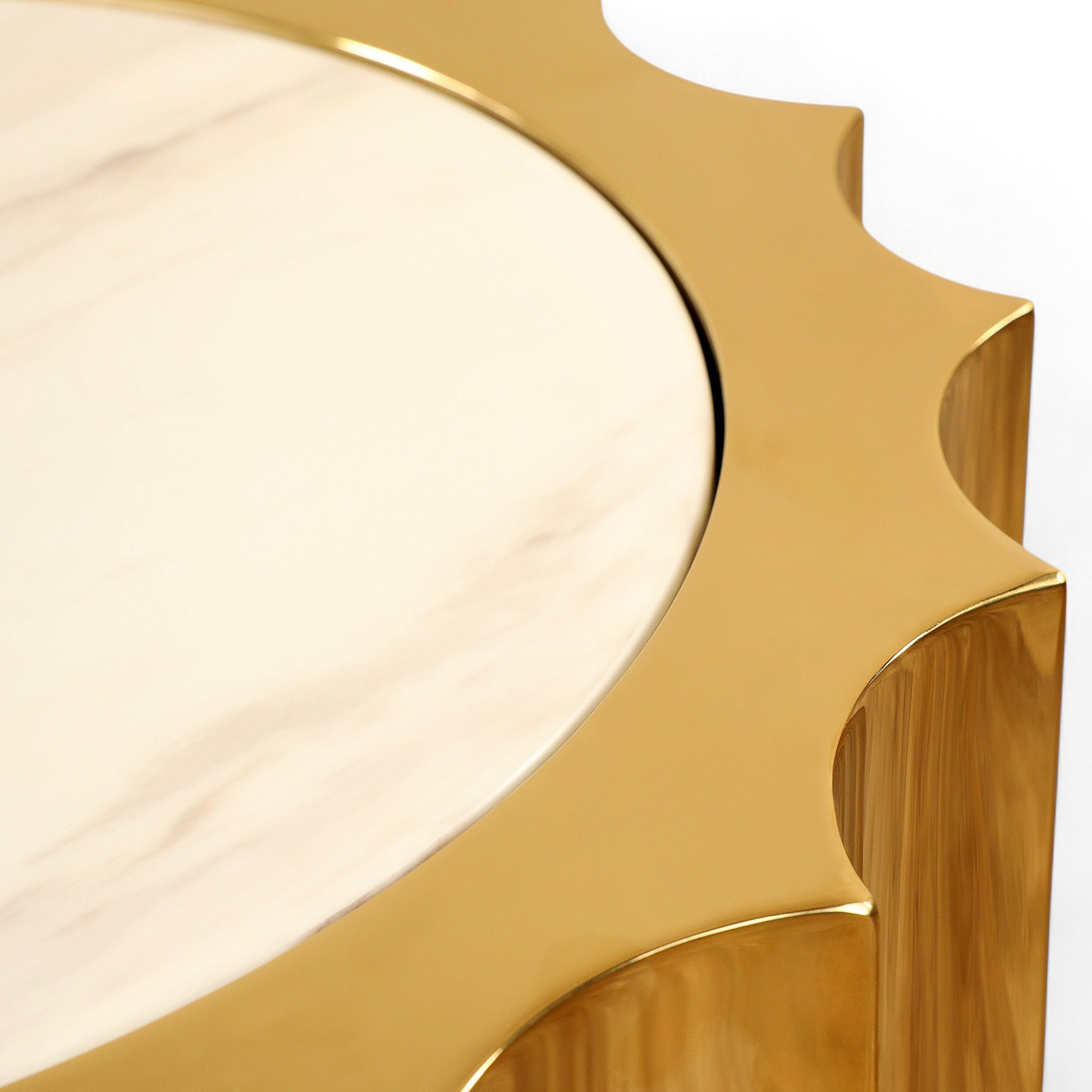 Perfectly sized for use next to a chair or sofa the Dido coffee table is a stunning example of form and function. Crafted in stainless steel and finished in rich gold this side table is topped with sleek white marble for a winning combination. The fluted sides add interest to the overall look and offer a lux look for a lounge or living room.