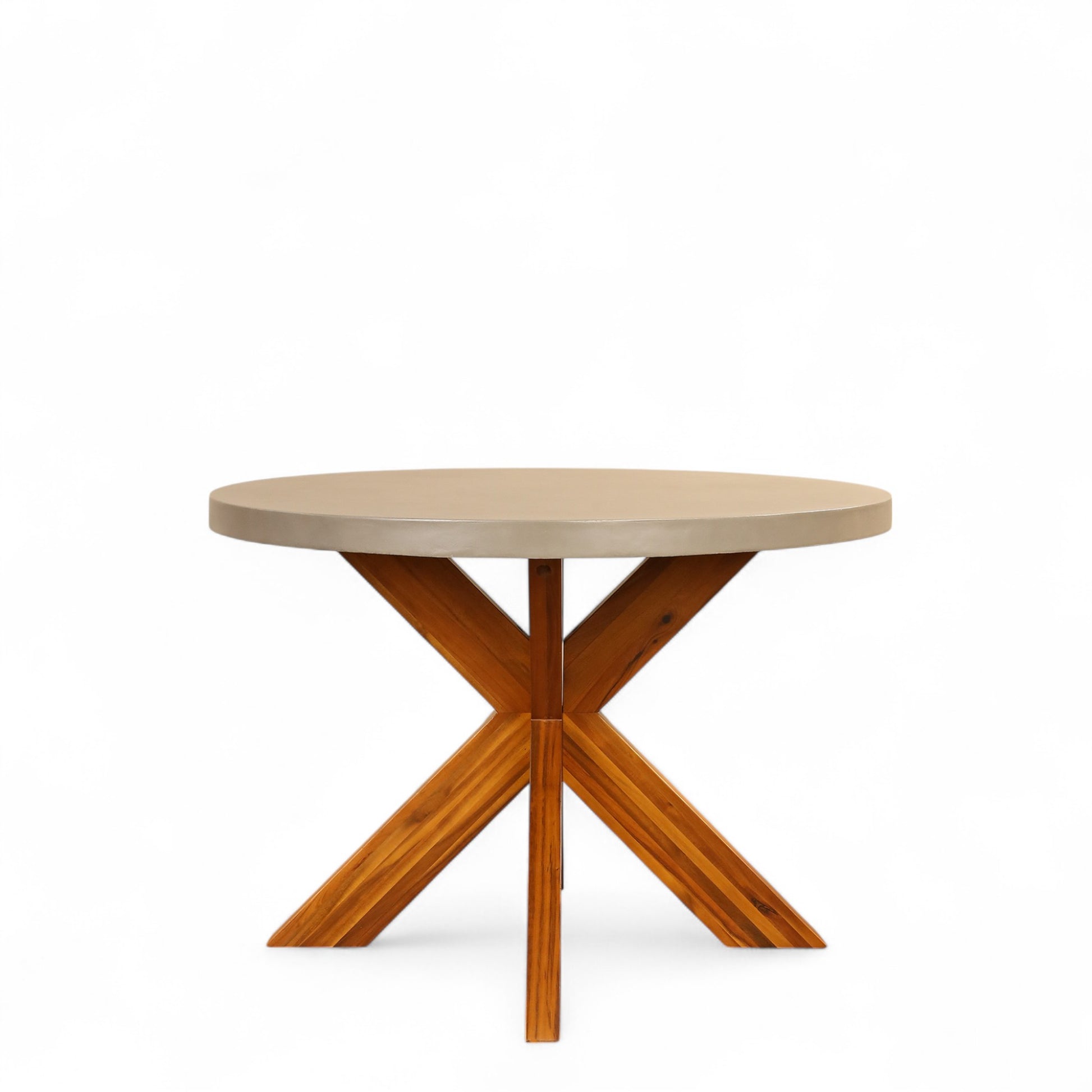 With a concrete top and solid wood-crossed base, this Dining Table casts industrial material into a timeless circular silhouette. Textural and contemporary this table will add an understated element to your decorating style.