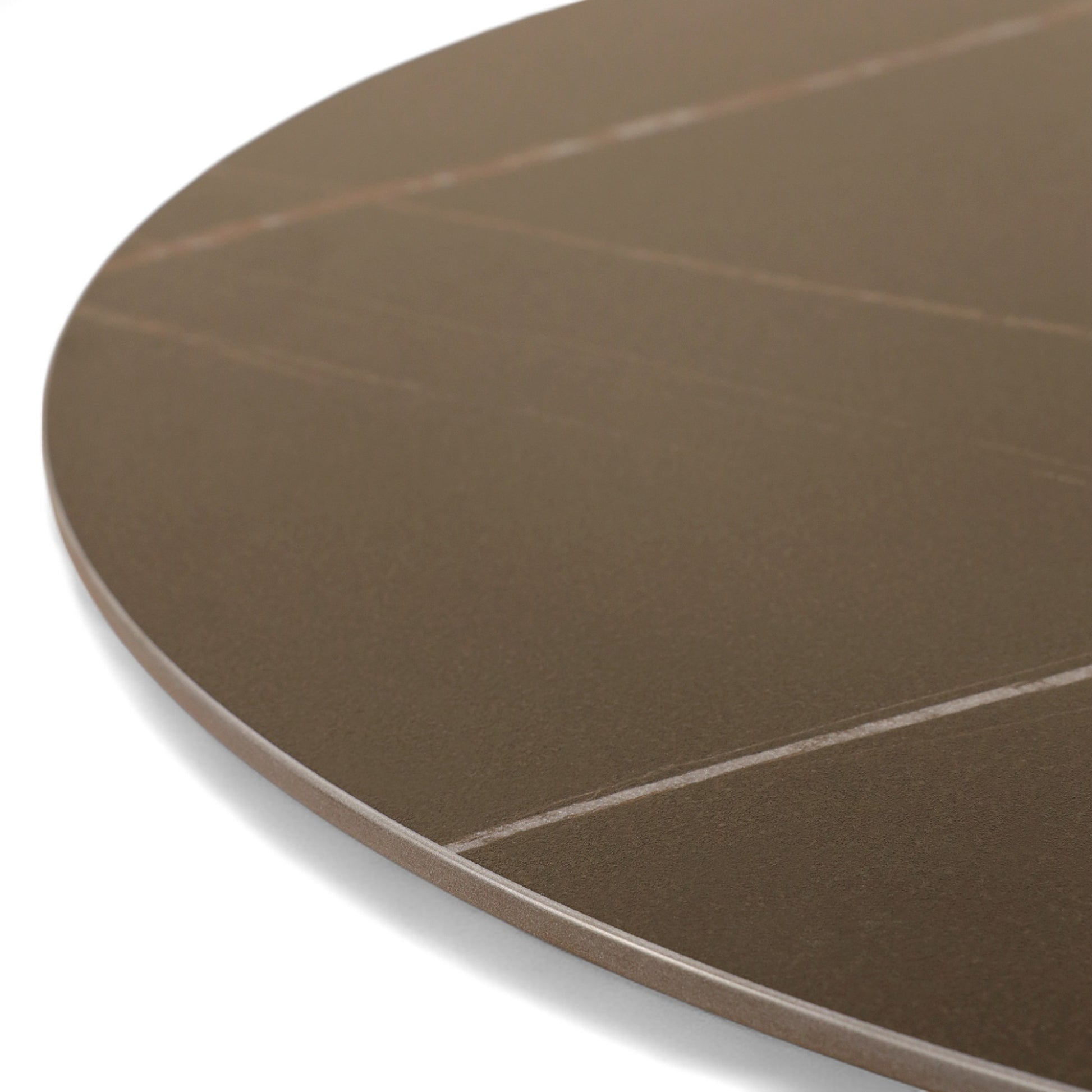 This elegant pedestal table pairs metal and marble for a bright modern look. Crafted from stainless steel the base features a gleaming gold finish for a luxe touch. The tabletop is crafted from exquisite sintered stone creating both material and silhouette contrast against the minimalist base.