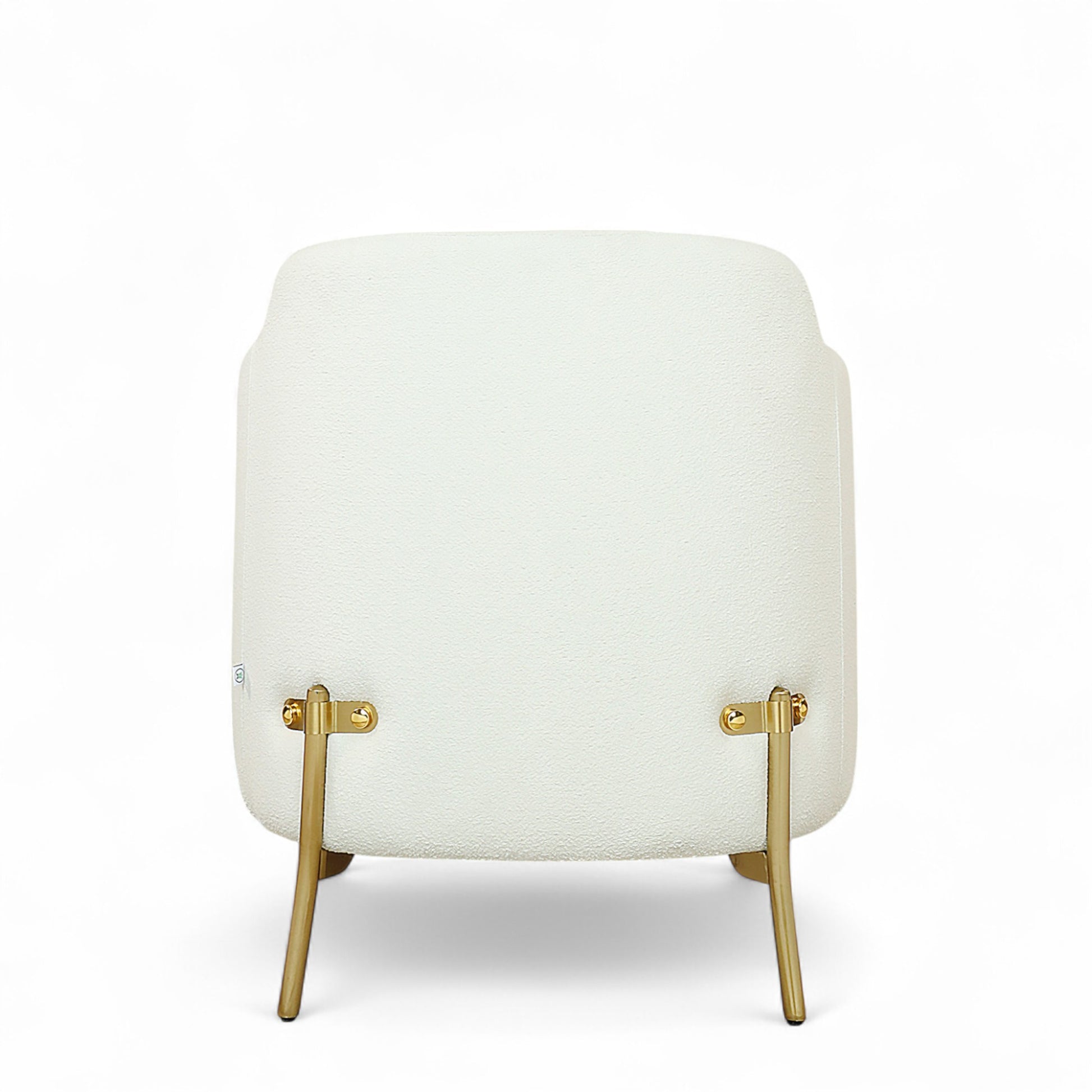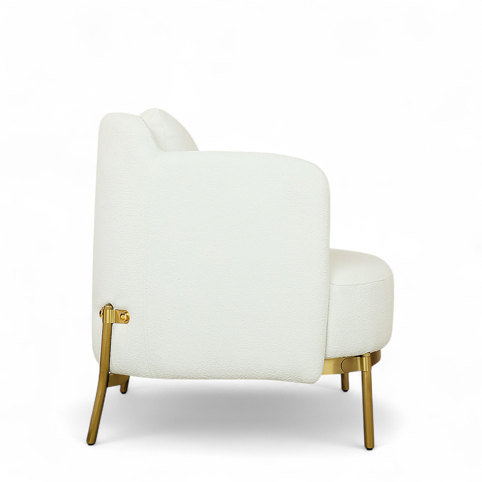 Inspired by mid-century modern low-profile silhouettes the Evi armchair is updated with modern materials and details. Crafted with a cushioned back, wrap-around arms, and a generous seat this lounge chair is upholstered in wonderful boucle fabric for the epitome of comfort and style. The base is stainless steel finished in chrome gold to lend a glamorous touch.
