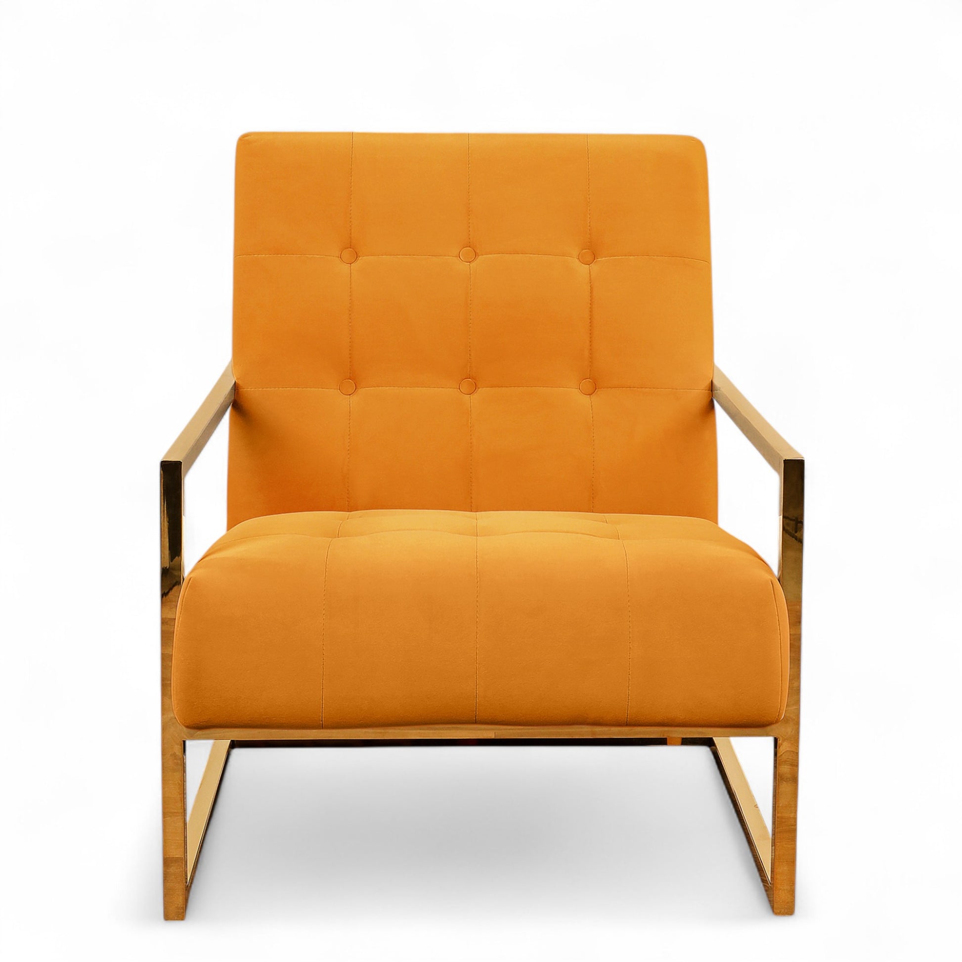 The Michele lounge chair delivers a distinct mid-century modern silhouette reimagined for modern lounging. Chrome gold stainless steel framing supports the cushy sling seat upholstered in velvet for an inviting and stylish look.