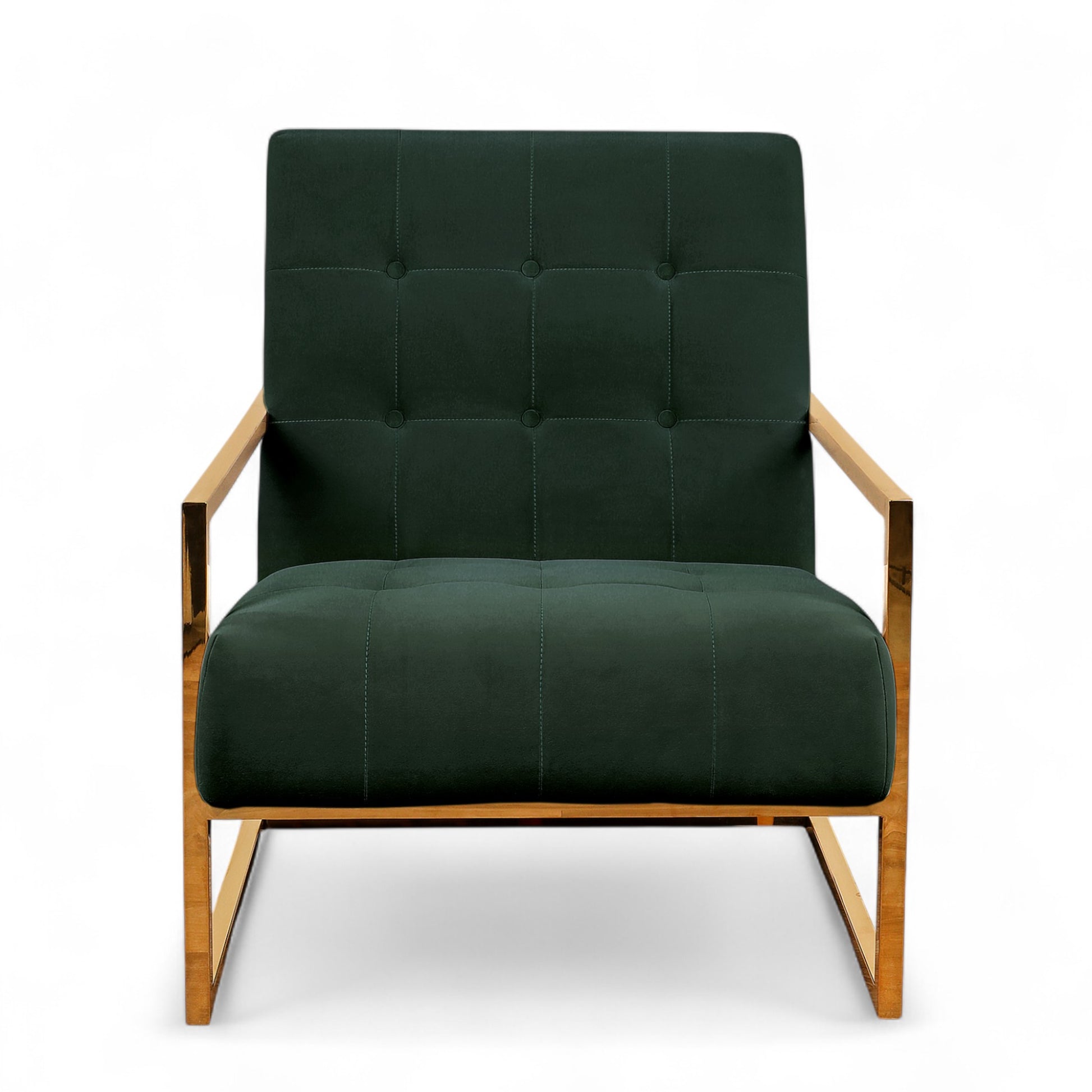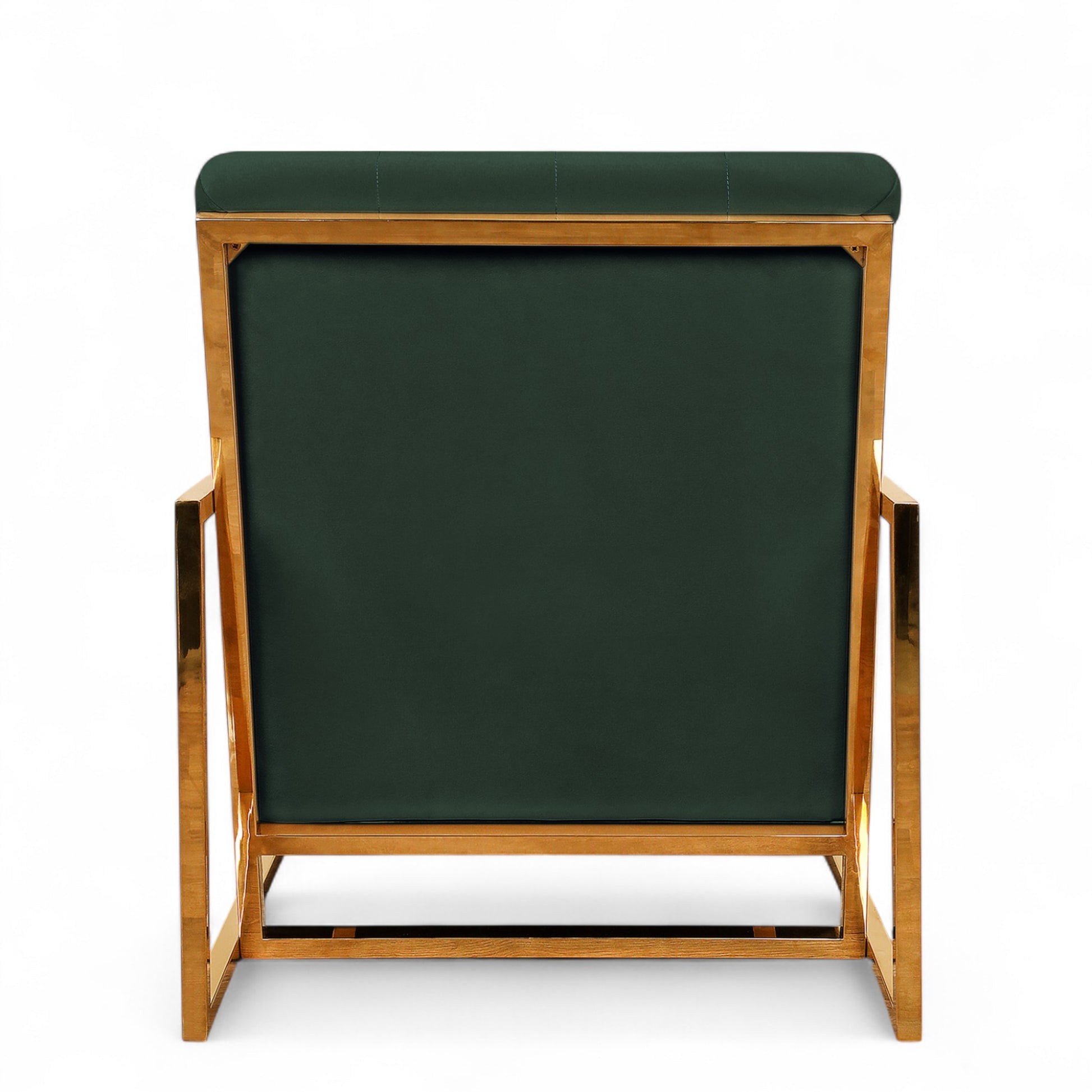The Michele lounge chair delivers a distinct mid-century modern silhouette reimagined for modern lounging. Chrome gold stainless steel framing supports the cushy sling seat upholstered in velvet for an inviting and stylish look.