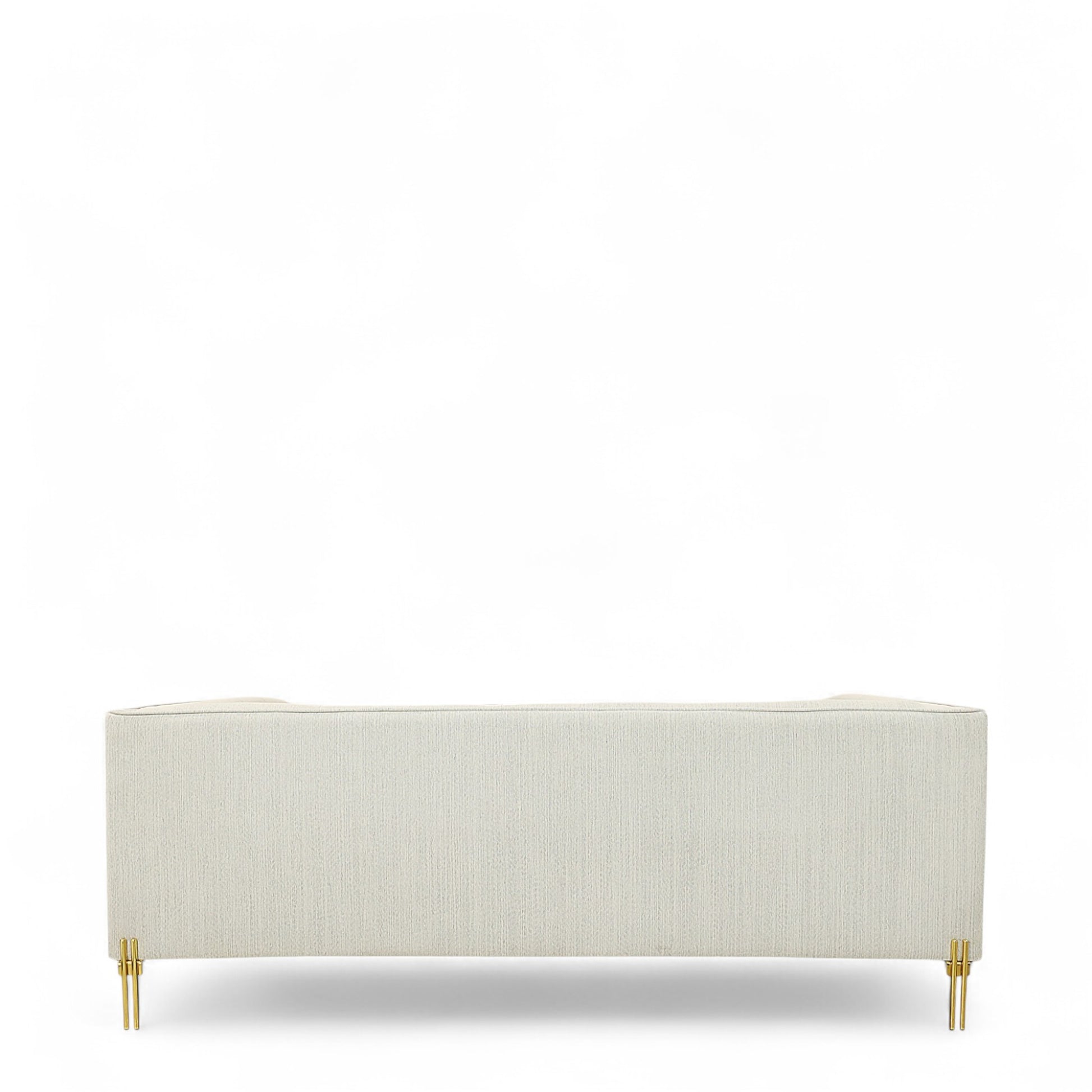 Squared arms provide a clean and crisp silhouette while the button-tufted back, linen fabric, and gold legs add sophistication, creating a visual appeal that is both refined and welcoming.