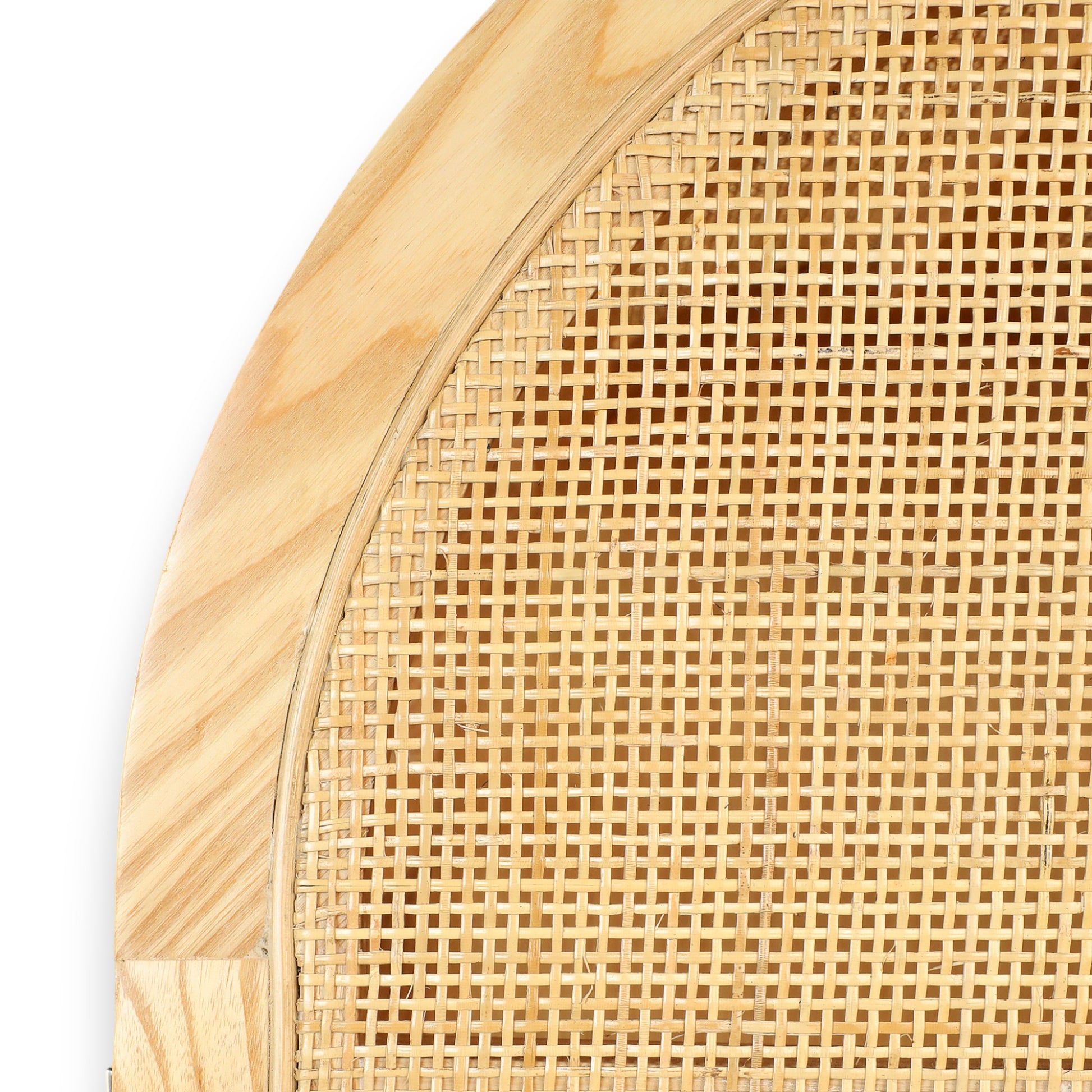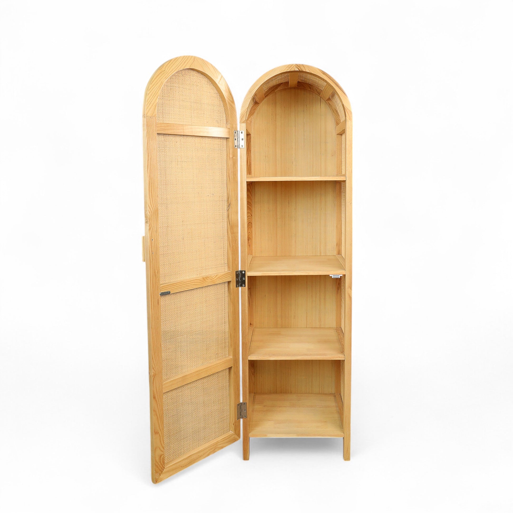 Lend a natural touch to a decorating style as well as convenient storage space with the Saga Cabinet. It is designed in wood with a beautiful woven rattan front that opens to reveal four roomy shelves for books, clothes, or household goods. Raised on wood legs, this cabinet has an arched top for a traditional look.