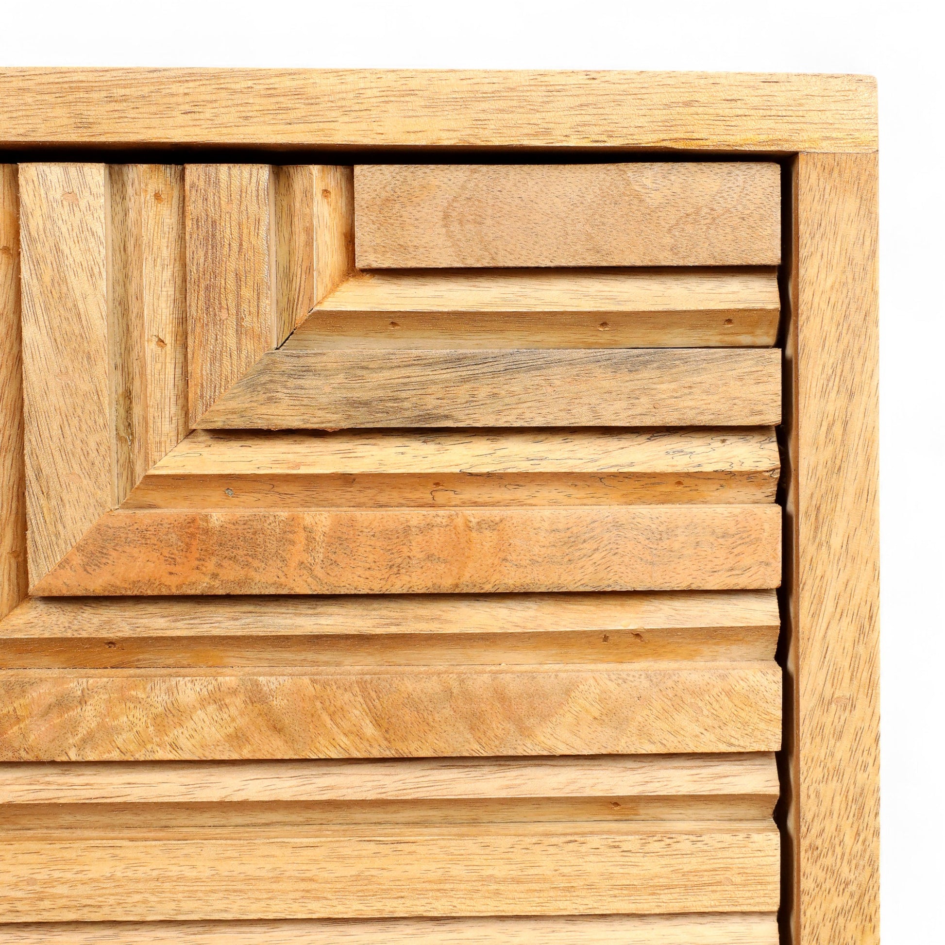 Add spacious out-of-sight storage to your living or dining area with this contemporary Wooden Sideboard. Crafted with a geometric front and coordinating metal pulls, this Cabinet offers abundant organizational space and chic style to lend interest to any decor.