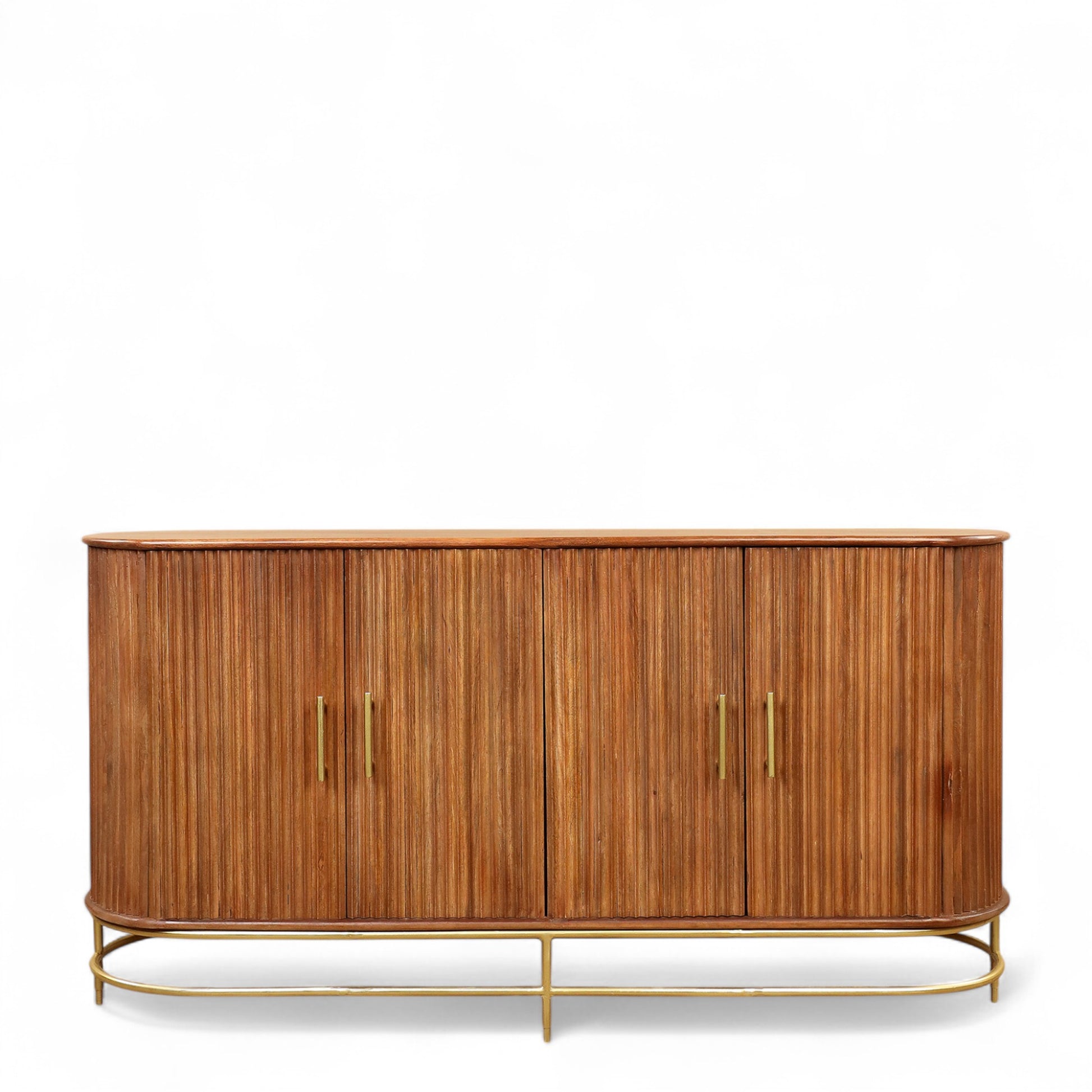 The wraparound style of this Sideboard perfectly blends Art Deco and Mid-century modern styles for an updated contemporary look and feel. Designed with a vertical motif mirrored by the sleek metal handles, this Wooden Sideboard offers generous storage as well as polish to complete a space.