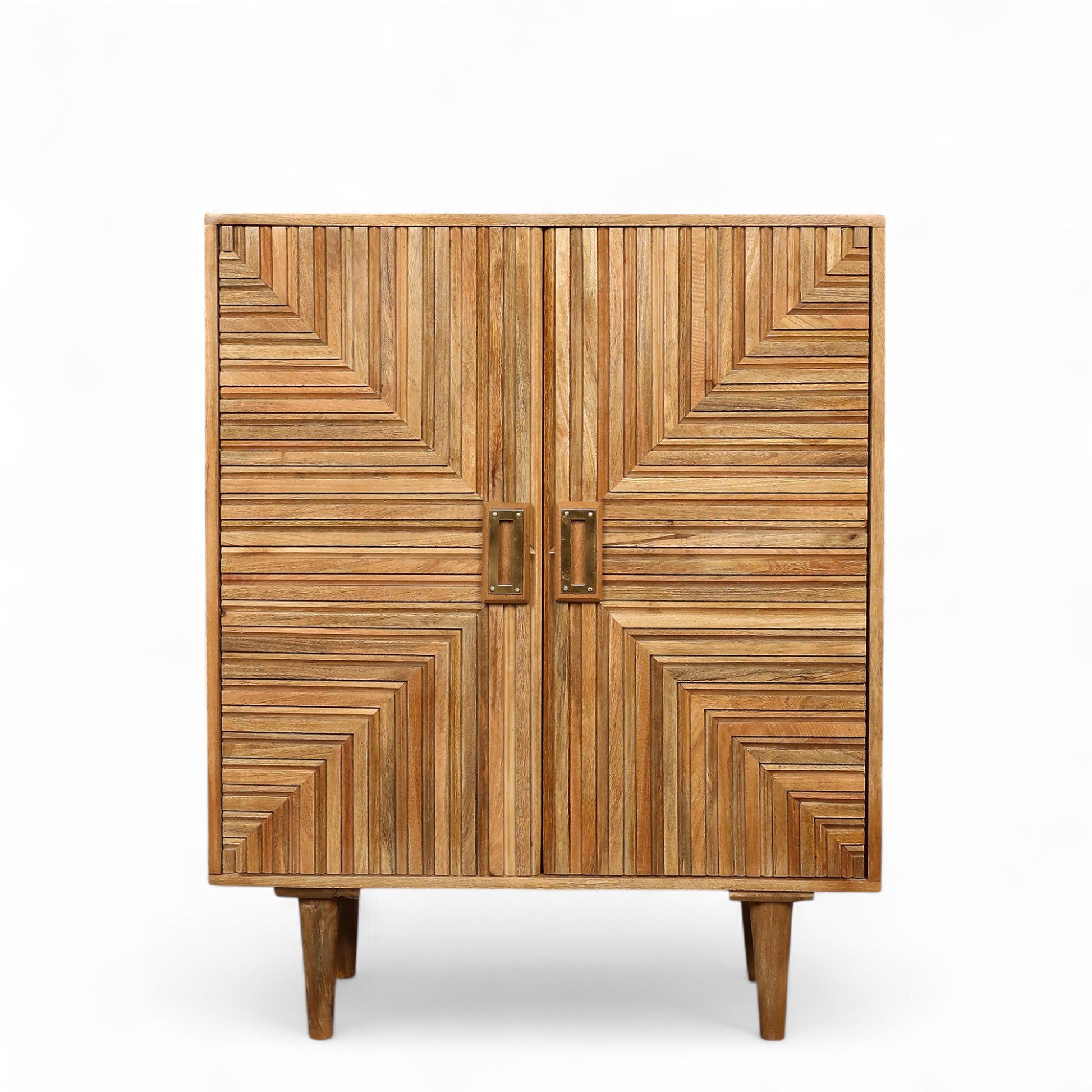Add interest to a decorating style with a carved front sideboard great for functionality and beauty. Crafted in solid wood with geometric door panels this sideboard offers room for convenient storage and a spacious surface for display.