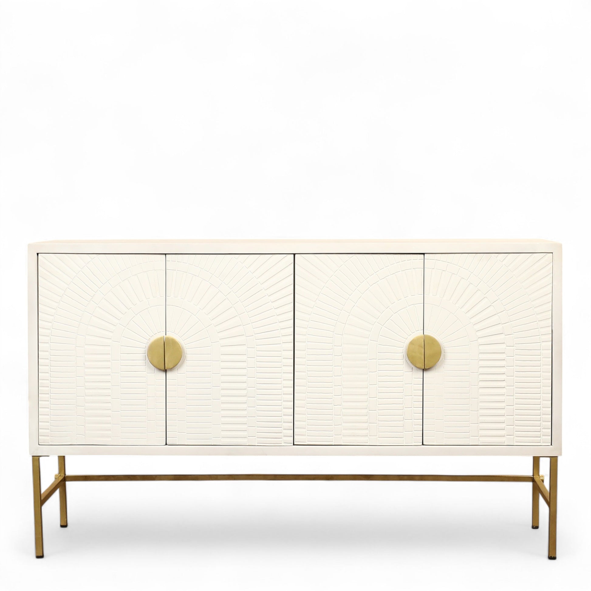 Elevate the style in any room with elegant storage. Perfect for many decors, this Wooden Sideboard has a carved design accented beautifully with gold metal hardware. The doors open to reveal abundant storage perfect for household items in the lounge, dining room, or foyer.