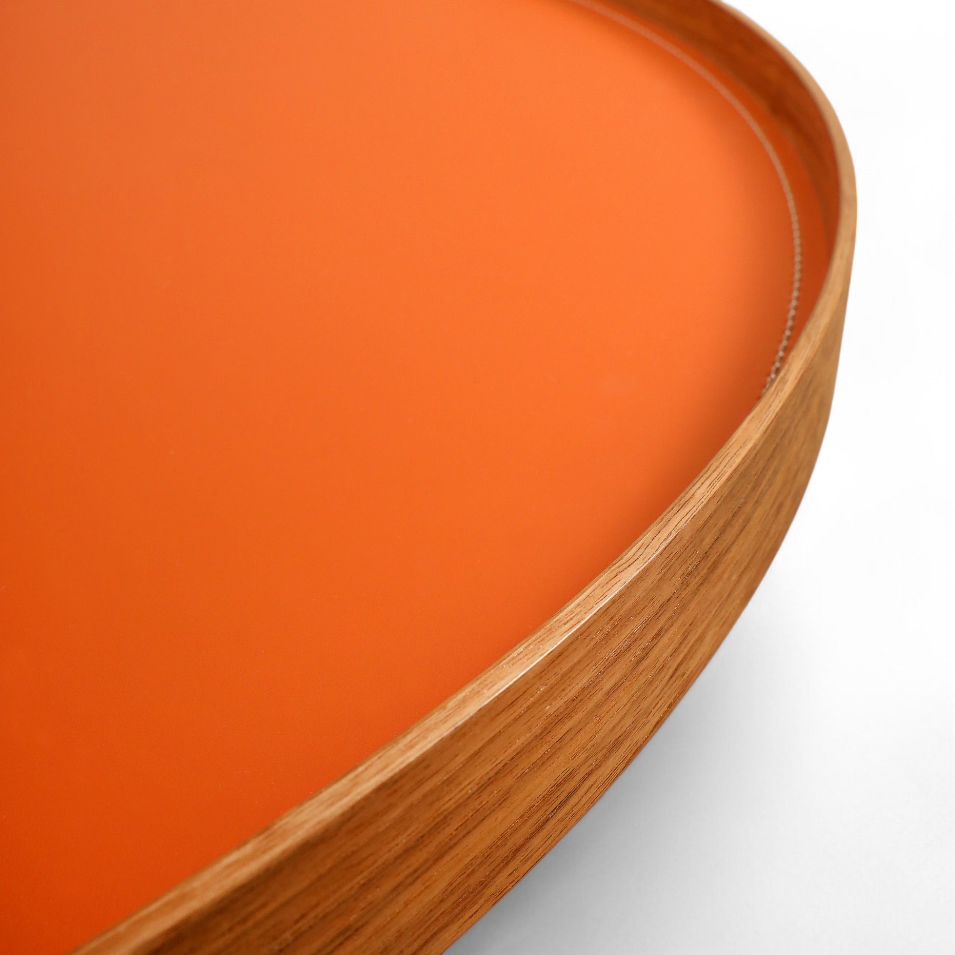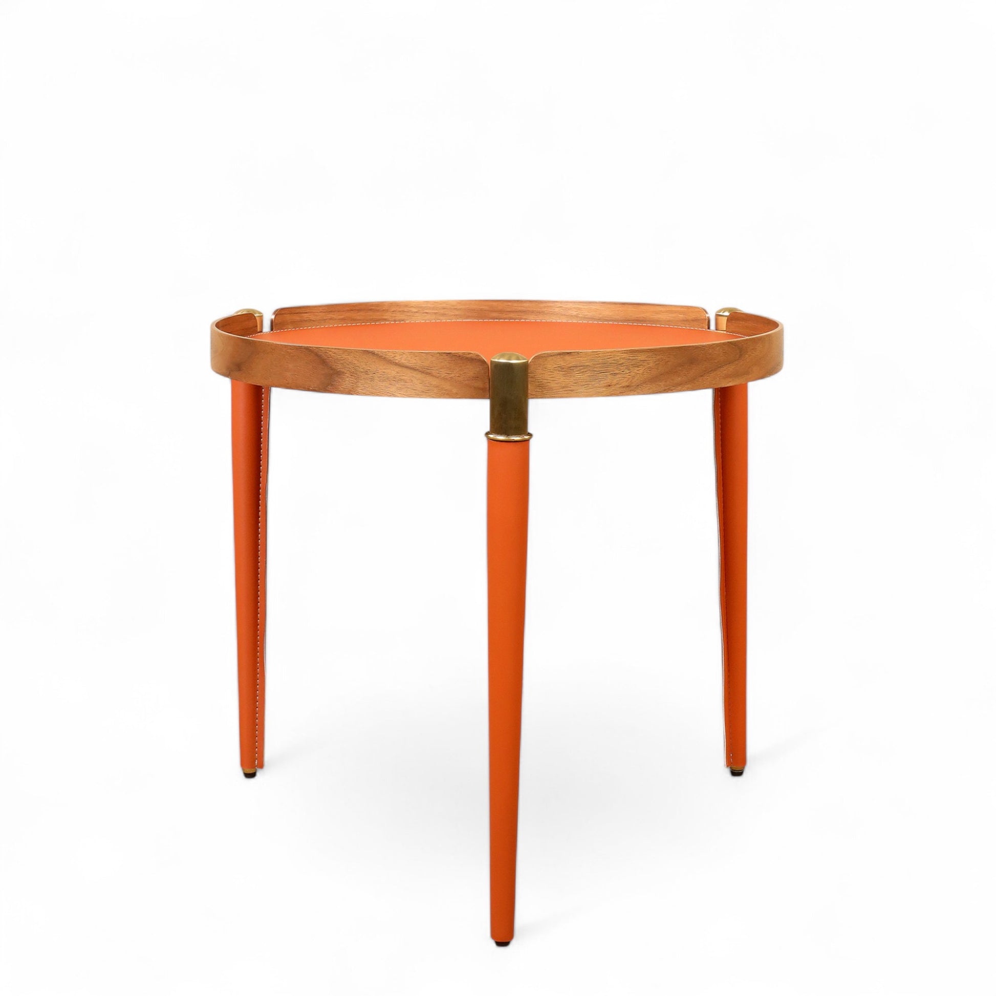 This stunning piece is a modern piece crafted from Chrome Gold Stainless Steel complemented by supple Saddle Leather. The design features a round top with elegantly raised sides, adding both style and function. Supported by three slender legs, this piece embodies a sleek, modern aesthetic, making it a striking addition to any contemporary space.